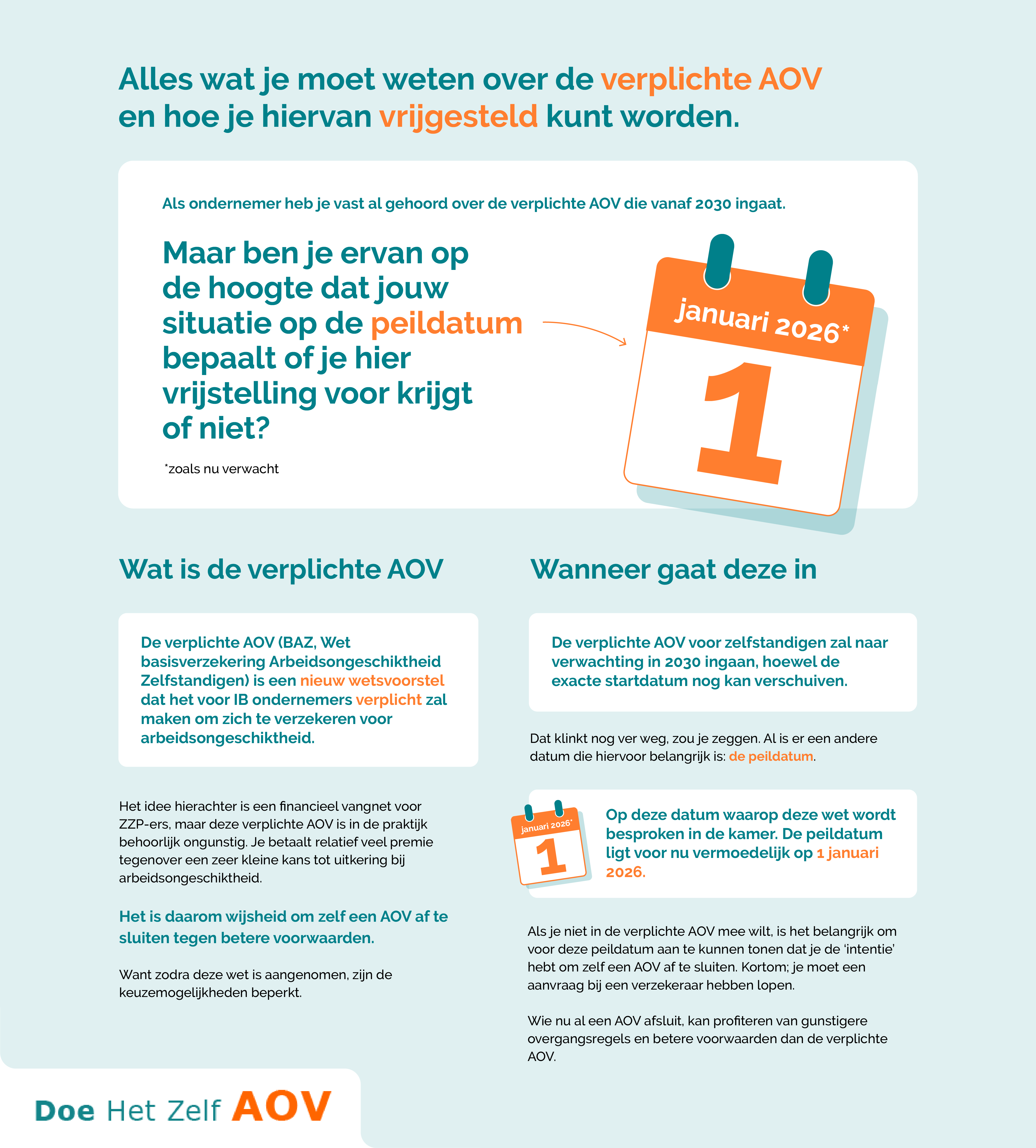 De verplichte AOV (BAZ, Wet basisverzekering Arbeidsongeschiktheid Zelfstandigen) is een nieuw wetsvoorstel dat het voor IB ondernemers verplicht zal maken om zich te verzekeren voor arbeidsongeschiktheid. De verplichte AOV voor zelfstandigen zal naar verwachting in 2030 ingaan, hoewel de exacte startdatum nog kan verschuiven.